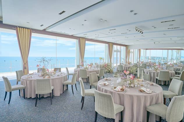 どこまでも続く水平線を一望できるロケーションが魅力!ワンフロア貸切のパーティーが叶う。広いテラスも使えるので、カクテルパーティーなど自由な演出で盛り上げて!